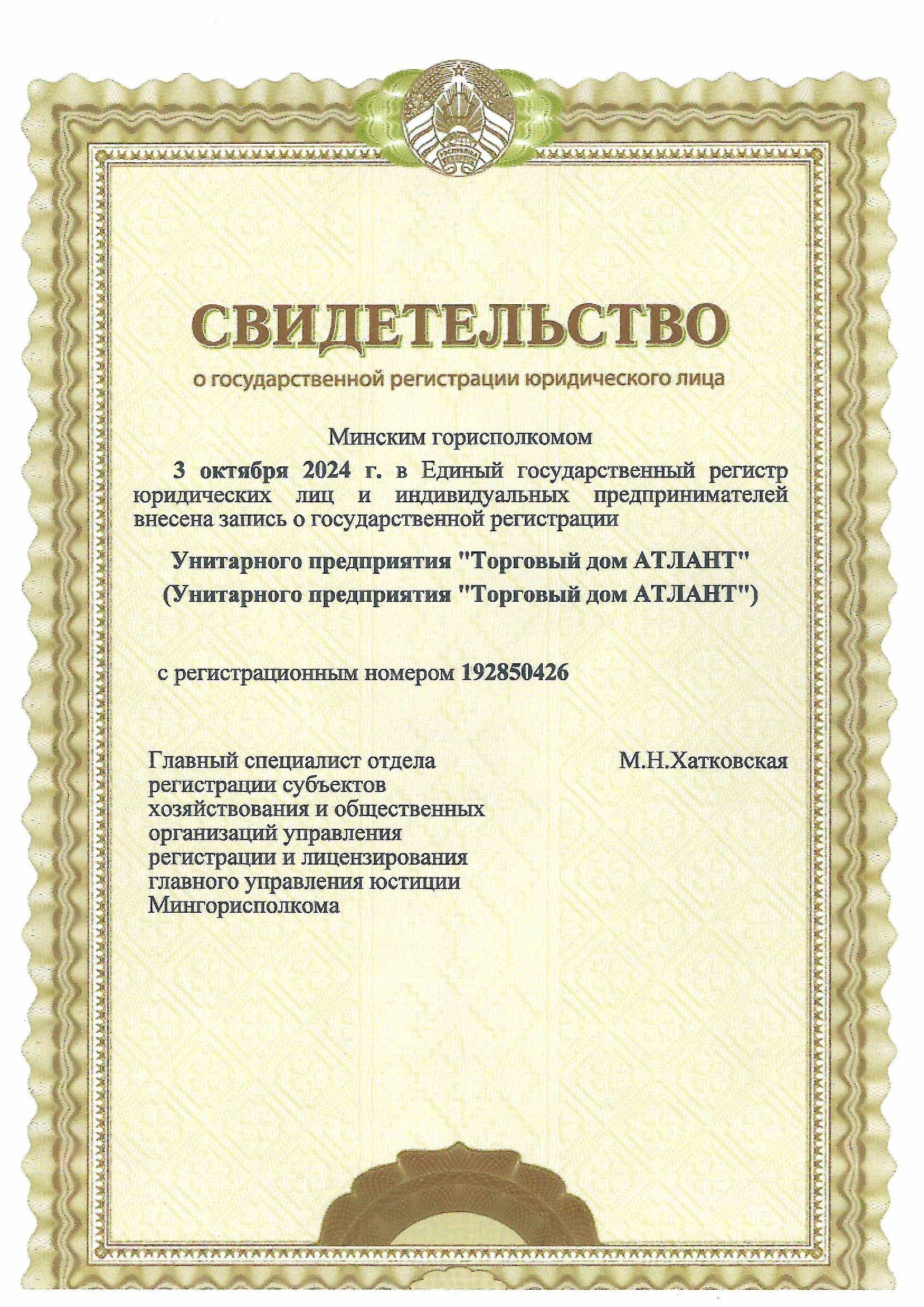 УНП 192850426 интернет магазин atlant-td.by. Свидетельство о государственной регистрации №192850426 от 3.10.2024 г выдано Минским горисполкомом.