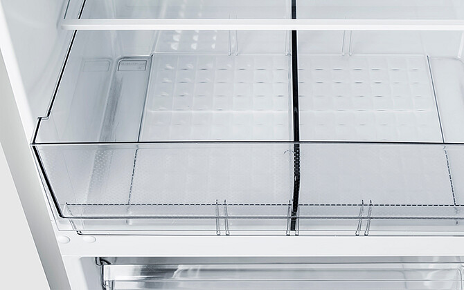 Стандартные корзины можно переставлять по высоте. Есть возможность использовать пространство морозильника без корзин: прутковый испаритель между корзинами выдерживает нагрузку до 20 кг при равномерном распределении.
