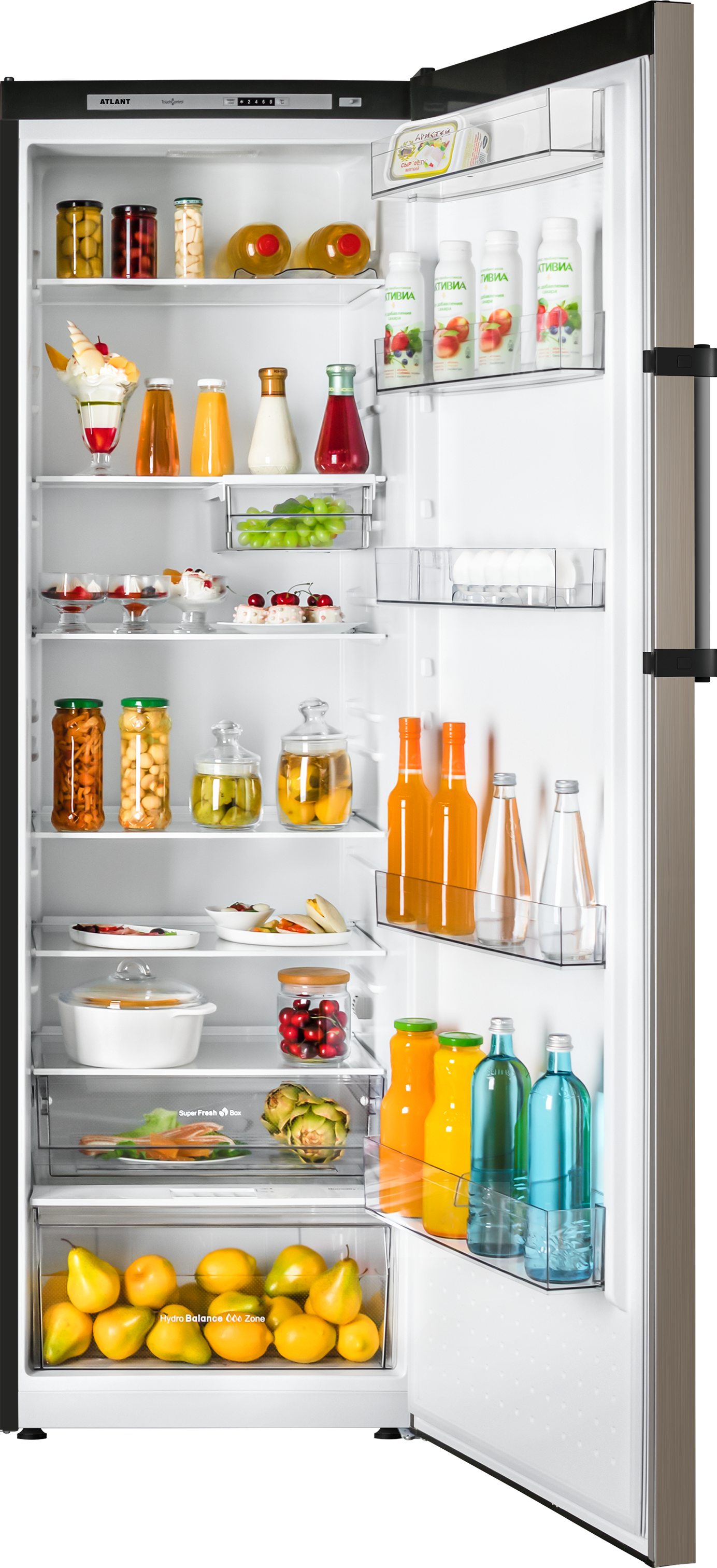 Регулировка влажности производится перемещением заслонки в полке над сосудом «Hydro balanсe zone», благодаря чему овощи и фрукты дольше сохраняют свою свежесть. Сосуд передвигается по роликовым направляющим.