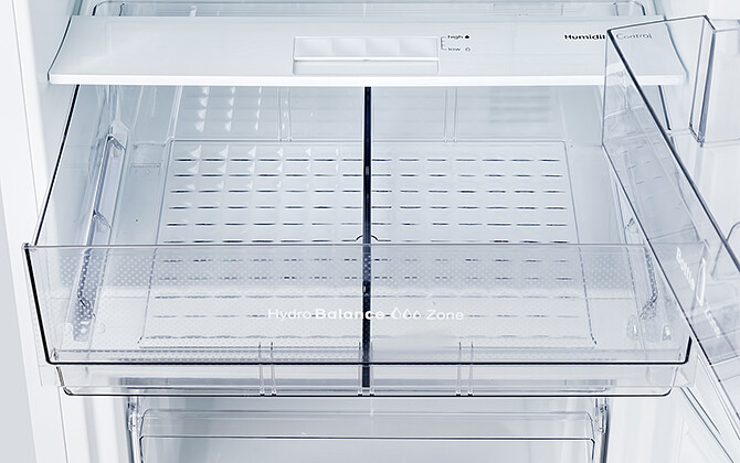 Регулировка влажности производится перемещением заслонки в полке над сосудом «Hydro balanсe zone», благодаря чему овощи и фрукты дольше сохраняют свою свежесть. Сосуд передвигается по роликовым направляющим.