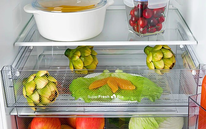 В «Super Fresh Box» скоропортящиеся продукты остаются максимально долго свежими, сохраняя свои вкусовые и питательные свойства. Отделение свежести передвигается по роликовым направляющим.